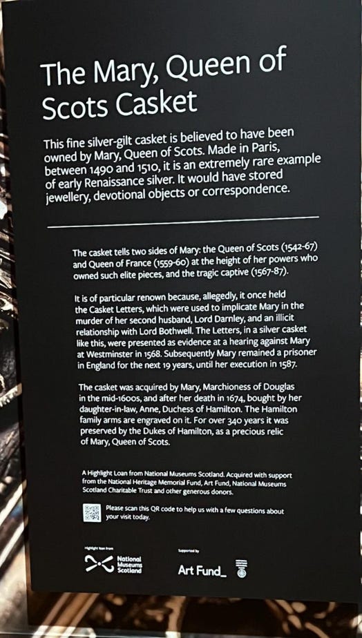 The labels and video explain the object – and repeat the old claim that the casket once held letters that were “evidence” that she was sleeping with the Earl of Bothwell and plotting with him to murder her husband, Lord Darnley.