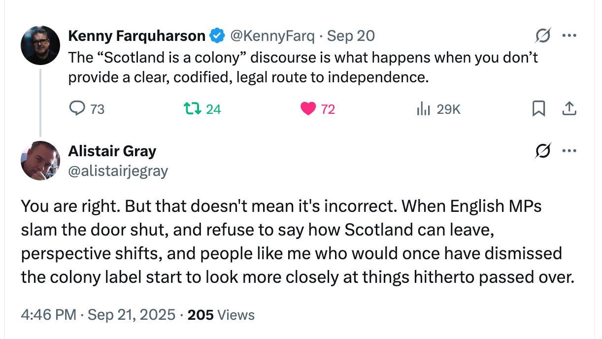 Even some Unionists are uncomfortable with the indefinite blocking of a referendum by Westminster. Times columnist and award-winning Substacker Kenny Farquharson tweeted about it here: